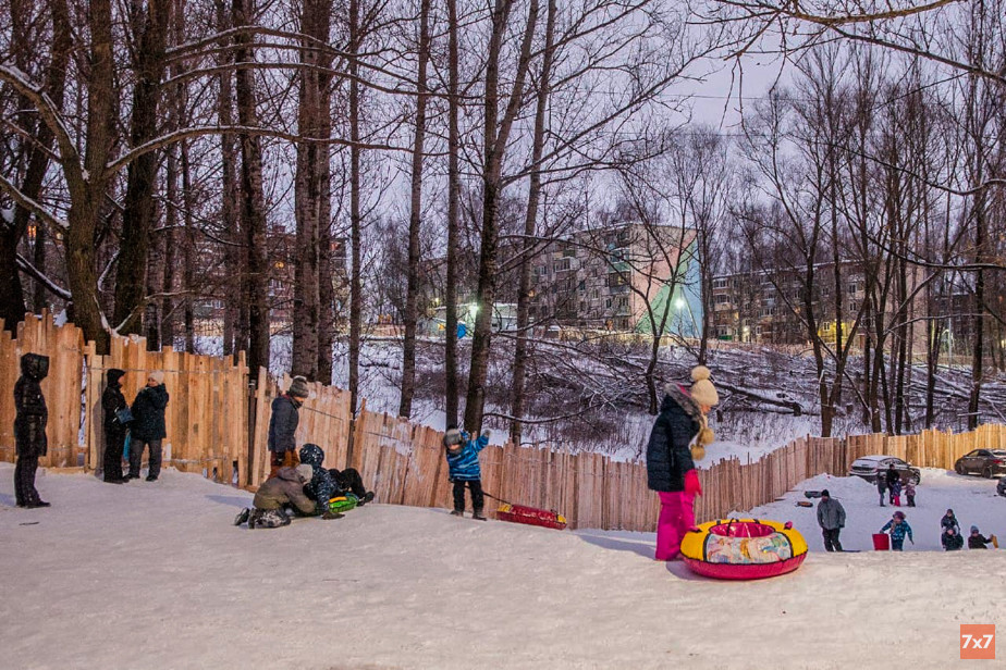 В середине декабря застройщик огородил участок дощатым забором. Через несколько дней часть забора оказалась поваленной на землю, а дети продолжили кататься на надувных «ватрушках» на привычном месте — со склона оврага.