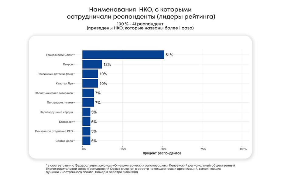 В исследовании участвовала 41 пензенская организация — это социально ориентированные НКО, наиболее активно работающие в последние три года. Изначально планировалось опросить 247 зарегистрированных организаций, список которых опубликован на сайте правительства Пензенской области и есть в отчете «Гражданского союза»*. Но не все согласились участвовать: контакты 70 организаций не удалось найти, 10 ликвидированы, остальные не ответили на вопросы анкеты.