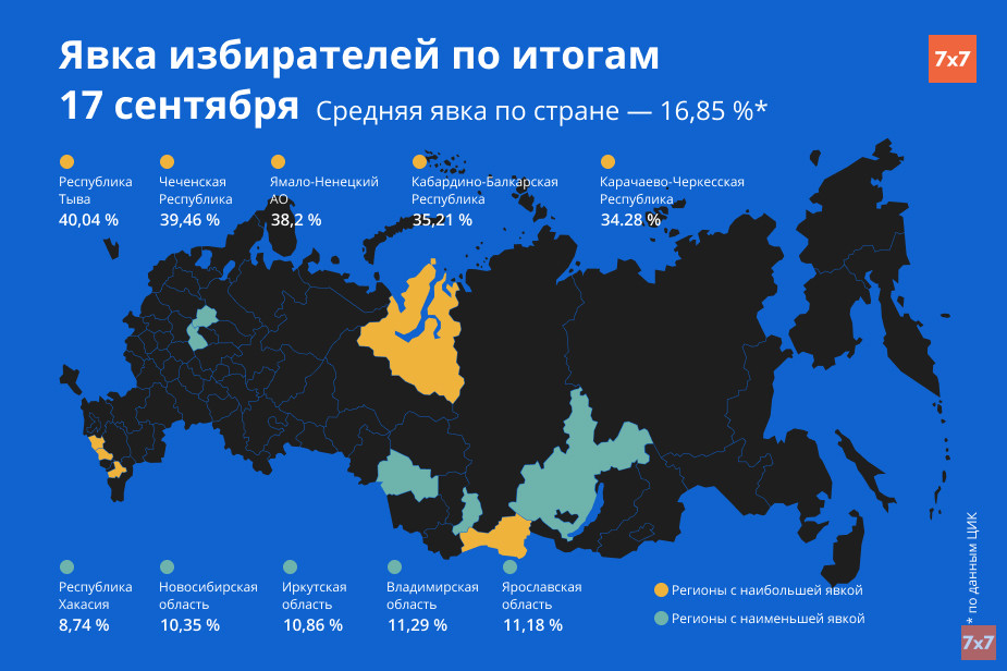По данным ЦИК, 17 сентября в России проголосовали 16,85% избирателей. Наибольшая явка зафиксирована в Тыве — 40,04%, Чечне — 39,46% и Ямало-Ненецком автономном округе — 38,2%. Наименьшая — в Хакасии 8,74%, Новосибирской — 10,35% и Иркутской областях — 10,86%.
