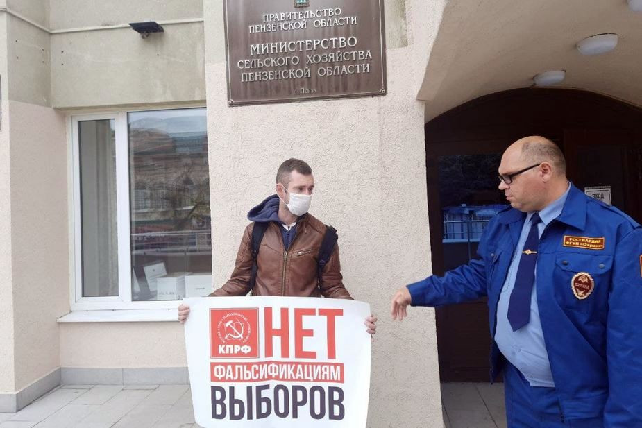 Одиночные пикеты против фальсификации итогов выборов в некоторых городах прошли еще вечером в пятницу, 24 сентября. В Пензе сотрудники Росгвардии пытались задержать члена КПРФ Дениса Бусыгина, который вышел с плакатом «Нет фальсификации выборов!» к зданию областной избирательной комиссии. Как сообщила «7х7» первый секретарь пензенского горкома Юлиана Котова, Росгвардию вызвала охрана здания, но попытки скрутить пикетчика закончились ничем. Прибывшие на место сотрудники полиции не увидели повода для задержания и только взяли у Дениса Бусыгина объяснения. Он простоял в пикете около часа. Затем его сменил комсомолец Сергей Балясников. Он также провел час у входа в избирком с плакатом «Фальсификаторов под суд!».