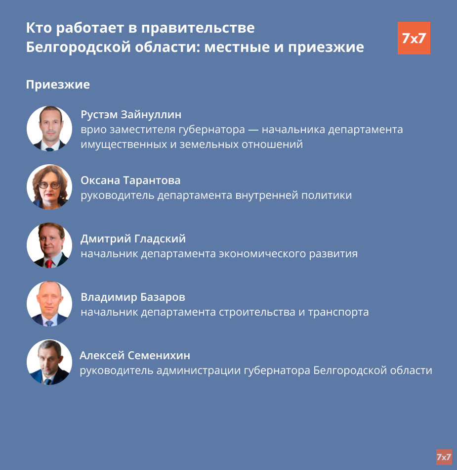 После громких увольнений и отставок ключевые должности в правительстве региона начали занимать так называемые варяги — чиновники из других регионов России. На место уволенных Глаголева и Абрамова пришли коллеги Гладкова из Севастополя Владимир Базаров и Дмитрий Гладский. Должность начальника департамента имущественных и земельных отношений занял чиновник из Удмуртии Рустэм Зайнуллин. Единственным белгородцем, кто получил должность в правительстве, стал Константин Курганский. Он сменил на посту врио замгубернатора по социальному блоку Наталью Зубареву.