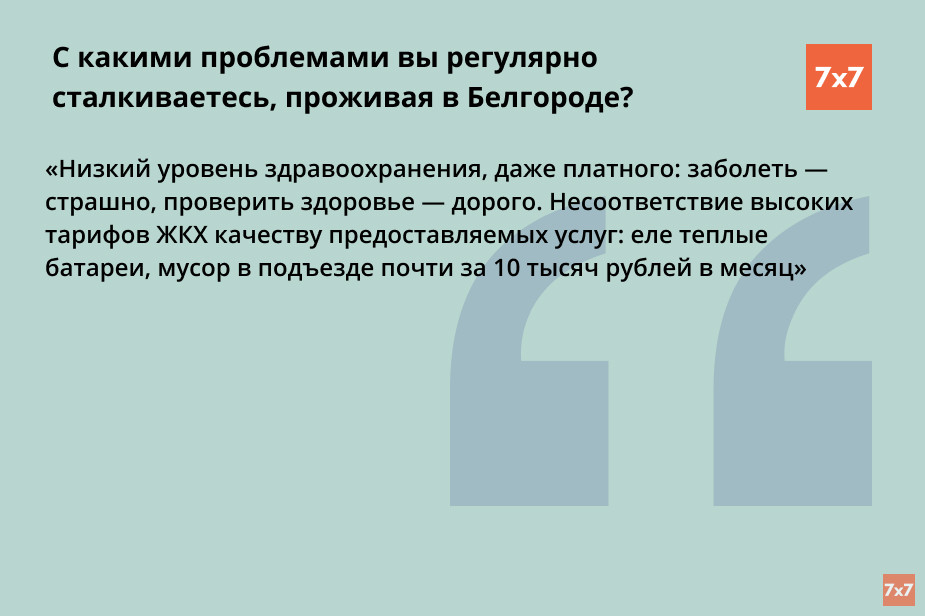 Кроме того, белгородцы регулярно сталкиваются с проблемами в медицине: трудная запись на прием к врачу, очереди и некачественное медицинское обслуживание. Горожан тревожат низкие зарплаты и высокие цены — особенно на недвижимость и ЖКХ.