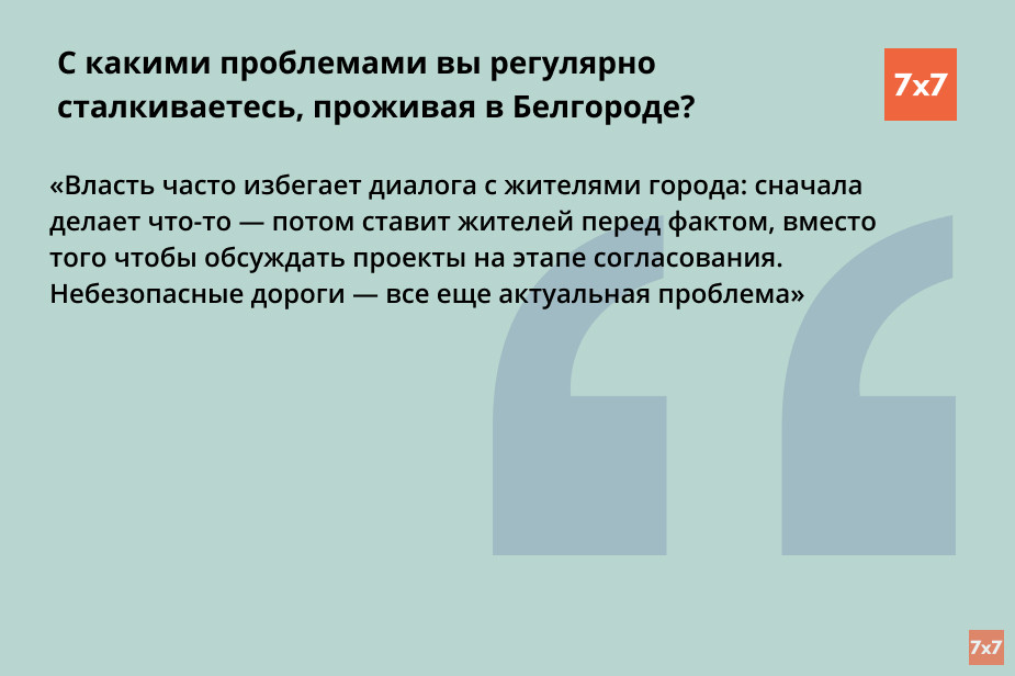 Основное требование — быть ближе к горожанам и выстраивать реальный диалог с обществом, «не для соцсетей». Некоторые белгородцы отметили, что не хотели бы видеть у нового мэра такого пиара, как у главы региона Вячеслава Гладкова.