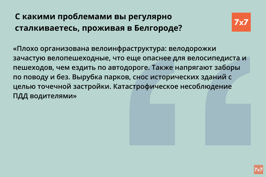 Большинство опрошенных обратило внимание на то, что на улицах Белгорода стало грязно, а зимой коммунальщики некачественно чистят снег. Несколько горожан пожаловалось на отсутствие контейнеров для раздельного сбора мусора в шаговой доступности. Часть белгородцев недовольна внешним видом зданий, многоэтажной застройкой в центре города и уничтожением зеленых зон. Участники анкетирования выразили недовольство состоянием Центрального парка и отказом властей от многолетних растений на городских клумбах. Недовольство у людей вызывает плохое освещение улиц и дворов, а также неразвитая велоинфраструктура.