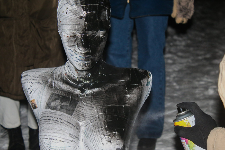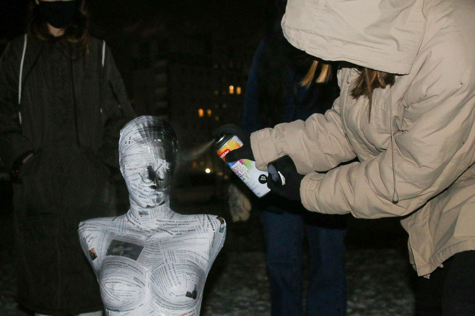 Марина: На завершающей акции в День прав человека мы снова использовали такой же манекен, как во время открытия. Первый манекен у нас отобрали в полиции, его так и не вернули. Это не было запланировано, но когда мы стали думать, как закрыть цикл, мы решили воспользоваться советом судьи, которая назначила нам штрафы.