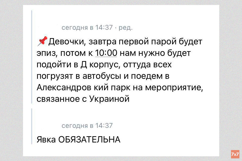 Несколько студентов агротехнического университета рассказали корреспонденту «7x7», что на акцию их позвали через социальные сети преподаватели и старосты групп. Учащиеся прислали в редакцию скриншоты сообщений, из которых следует, что явка на флэшмоб «Крымский мост» называлась «обязательной».