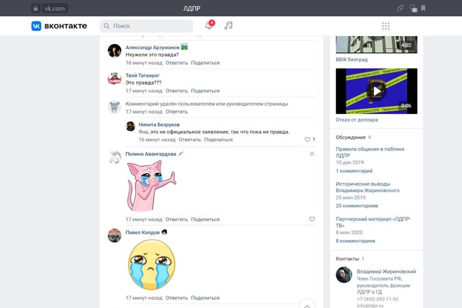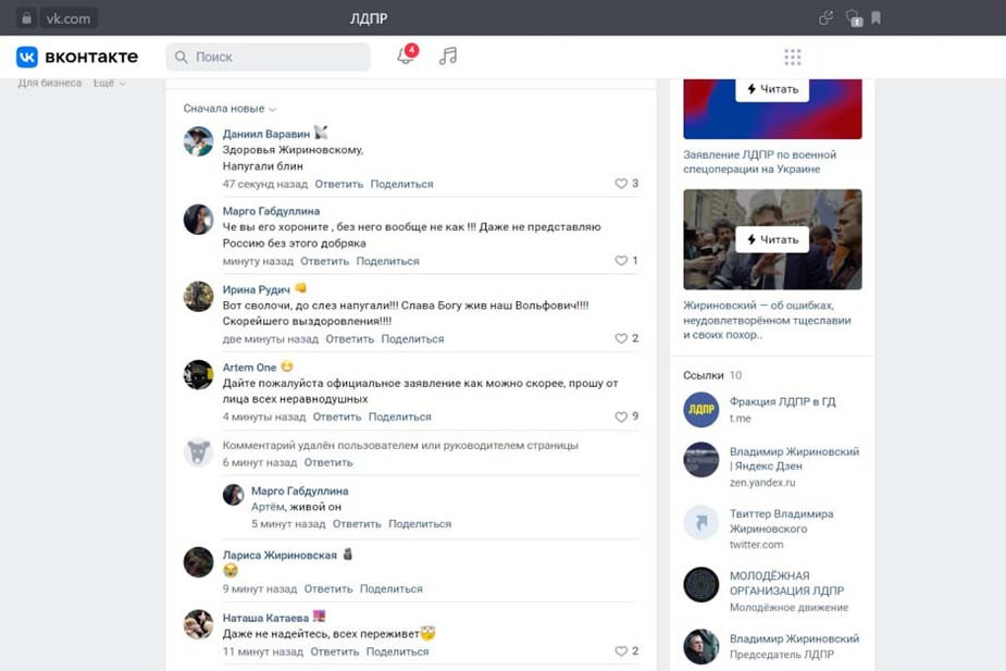 - В официальной группе ЛПДР в соцсети «ВКонтакте» модераторы стали удалять сообщения о смерти Жириновского. В том числе партия заявила, что подаст иск против тех, кто распространил новость о смерти политика.