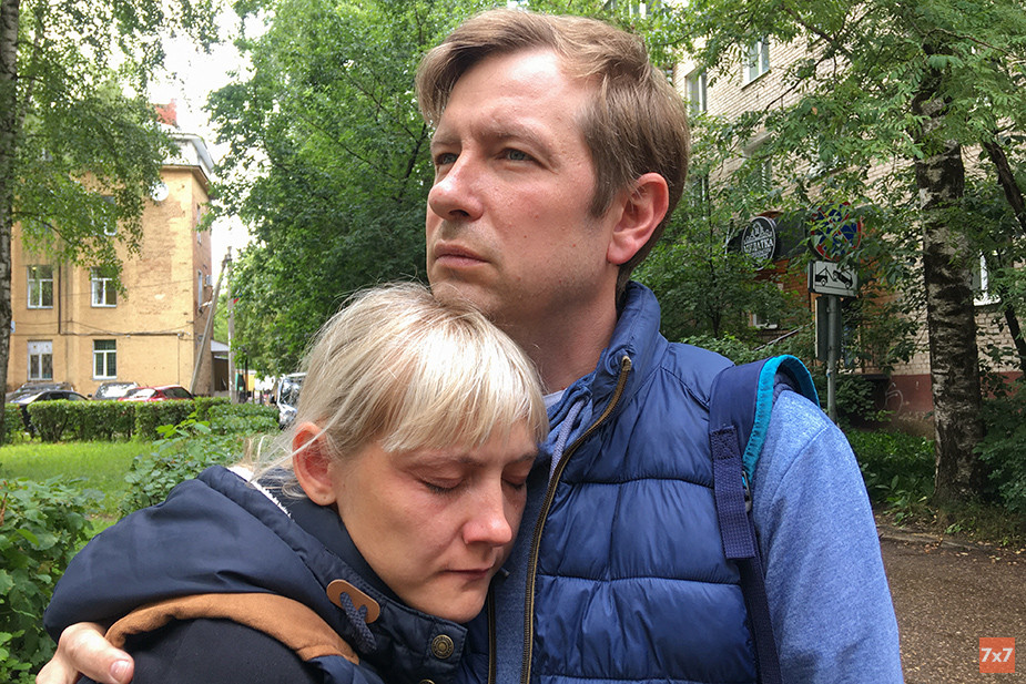 После этого пятое заседание завершилось, слушатели спешно потянулись к выходу. На крыльце, облокотившись о стену, стоит заплаканная Кристина Завьялова. Среди выходящих из здания суда она глазами ищет мужа. Вскоре появляется и он.