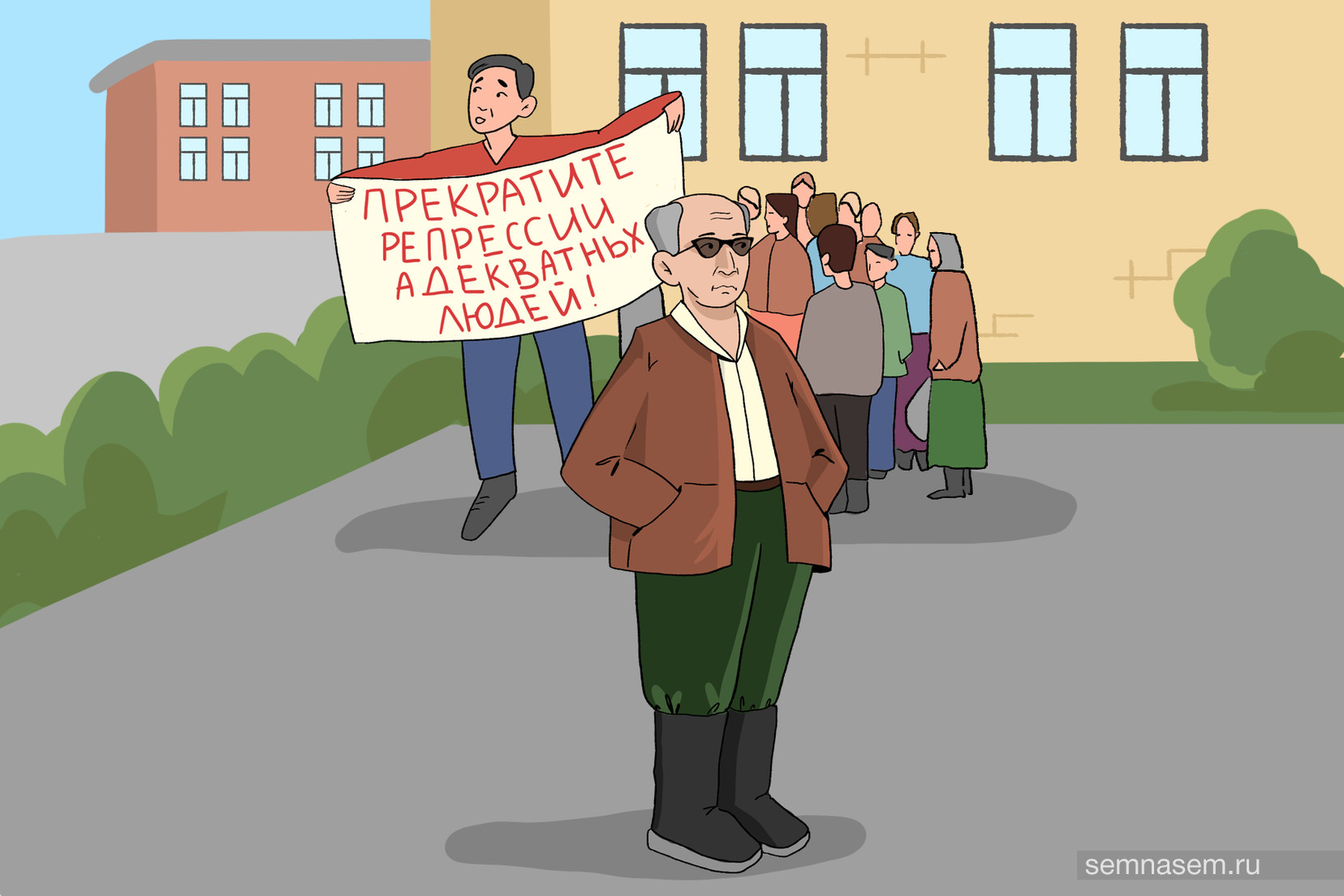 Утром в субботний день на площади Ленина собирается небольшая толпа — взрослые и молодые люди, которые готовятся по очереди вставать в пикеты против репрессий. У одного из них плакат со словами «Прекратите репрессии адекватных людей». Чуть поодаль от них на скамейке сидит мужчина в капитанской кепке — ветеран Владимир Степанов. Некоторые из участников пикета подходят к нему и здороваются, разговаривают, а затем уходят. Он сегодня не участвует в пикете, но пришел поддержать знакомых.