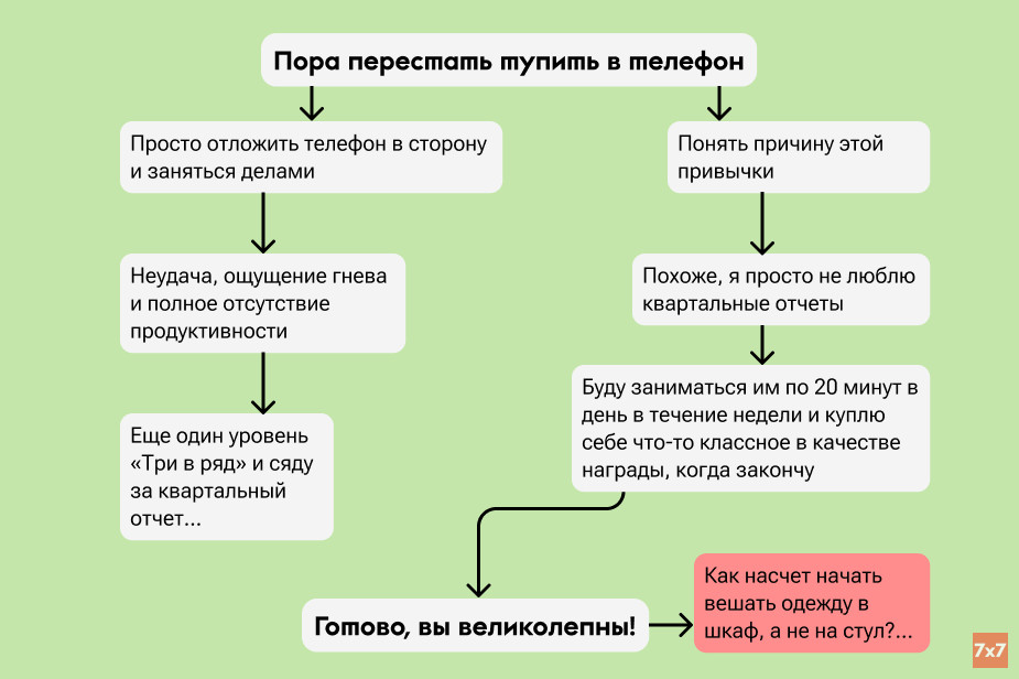 — Самое обидное, что такой подход трансформирует привычки очень медленно: стоит чуть отвлечься и сразу «просто делаешь это снова». Потому что не в поведении дело, — объяснила психофизиолог.