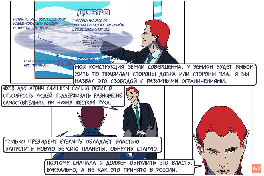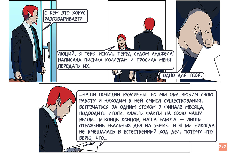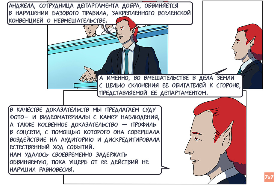 Обычно в конце месяца департаменты Добра и Зла небесной корпорации Eternity делают доклады о событиях на Земле, чтобы вычислить уровень равновесия между сторонами. Но в этот раз главная новость корпорации — суд над сотрудницей Департамента Добра Анджелой. Его инициировал секретарь Хорус, который хочет изменить устройство Земли: насильно разделить Добро и Зло в рамках планеты, не оставив людям возможности самим решать свою судьбу.