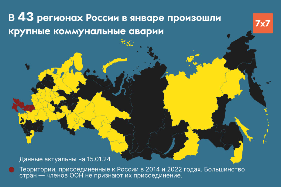 Зима в некоторые регионы России пришла уже давно, и вместе с похолоданием в стране начались коммунальные проблемы. С ноября Сибирь и северные регионы несколько раз в месяц оставались без отопления, света и горячей воды. Потом начали выходить из строя теплотрассы и котельные в Центральной России. В новогодние праздники коллапс усилился: морозы сменялись снегопадами, снегопады — очередными похолоданиями. О том, как российские регионы пытаются согреться при помощи изношенных труб и почему не всем это удается — в обзоре “7х7”.