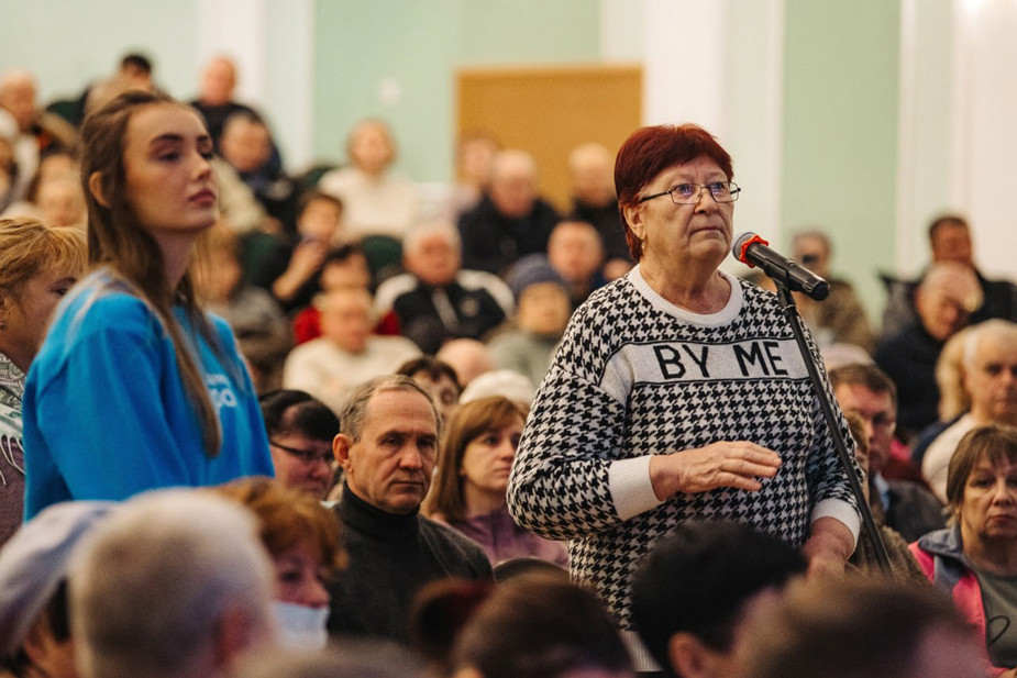 Зал вместил более 800 человек. Внутрь было не протолкнуться. Беженец в дверном проеме снимал на видео три мужские фигуры на сцене. Губернатор Алексей Смирнов стоял с микрофоном в руках и отвечал на все вопросы беженцев. Рядом с ним в креслах сидели два федеральных министра. Из Москвы приехали вице-премьер Марат Хуснуллин и экс-губернатор региона, а ныне министр транспорта России Роман Старовойт. Они сидели молча и делали пометки в блокнотах.