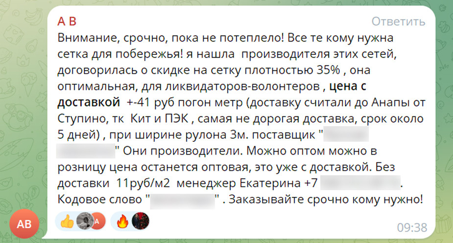 Волонтеры ищут способы эффективно собирать мазут с пляжей. Один из таких - дорогие сетки. Люди покупают их сами, как и средства индивидуальной защиты от паров нефтепродукта, а также многое другое. Одна из участниц чата волонтеров договорилась с производителем сеток о скидке.