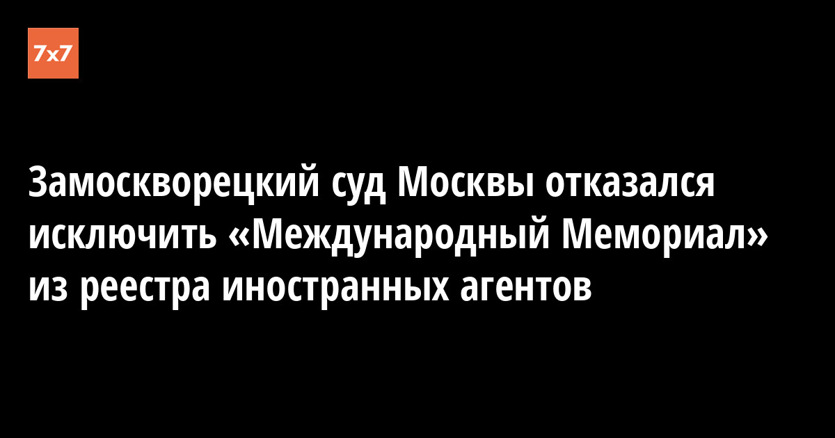 16 октября в Замоскворецком суде Москвы состоялось судебное разбирательство по иску «Международного Мемориала» к Министерству юстиции России. Суд отказал «Мемориалу», оспаривавшему распоряжение Минюста о включении организации в реестр некоммерческих организаций, выполняющих функции иностранного агента, — сообщил «7x7» пресс-секретарь суда.