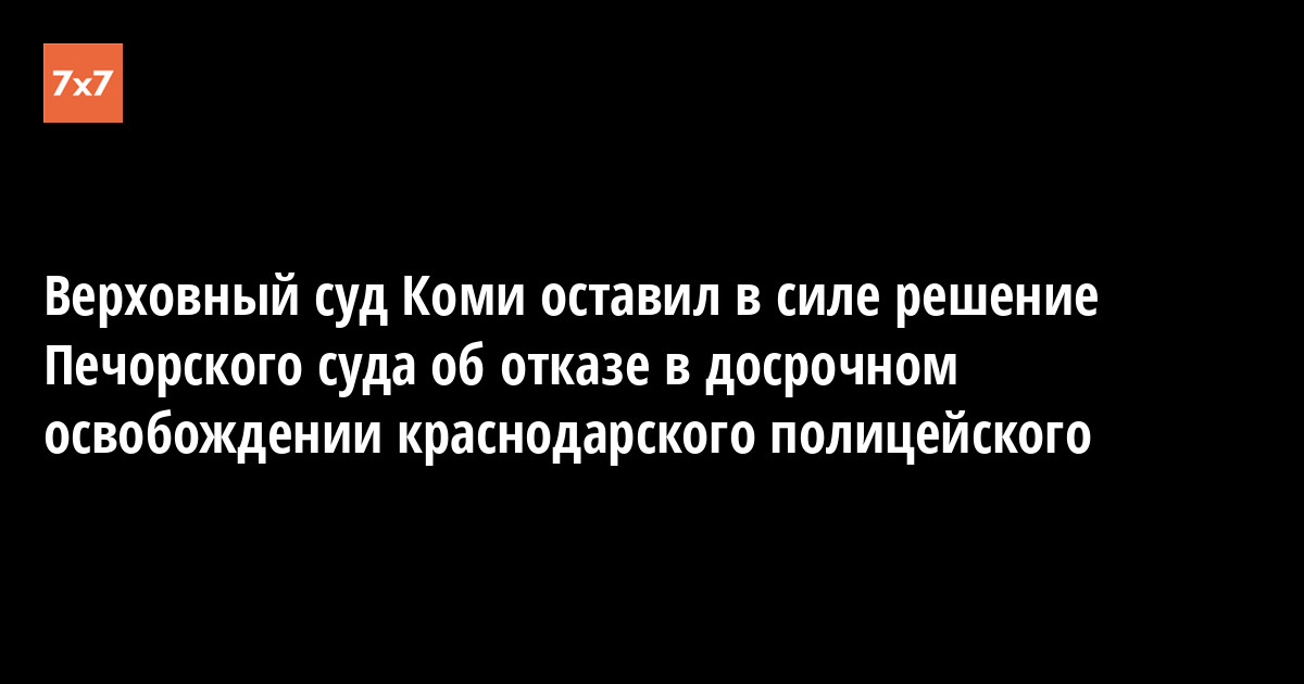 Верховный суд Коми отклонил апелляционную жалобу осужденного бывшего полицейского Фёдора Гонтаря на решение Печорского городского суда, который отказал в условно-досрочном освобождении из колонии. Об этом сообщил 7 марта корреспондент «7x7» из суда.