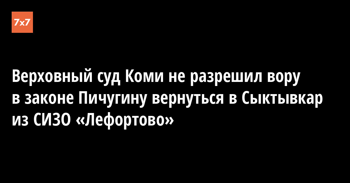 Верховный суд Республики Коми 14 июля не удовлетворил жалобу адвокатов обвиняемого в создании преступного сообщества Юрия Пичугина, которые оспаривали запрет на этапирование подзащитного из СИЗО «Лефортово» в Сыктывкар и отклонение жалобы на бездействие следователя, — сообщает корреспондент «7x7» из зала суда.