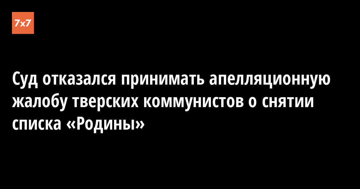 Московский районный суд Твери 11 сентября отказался принимать апелляционную жалобу коммунистов, в которой они просили снять с выборов в тверскую гордуму партию «Родина». Об этом «7x7» рассказал источник в «Родине».