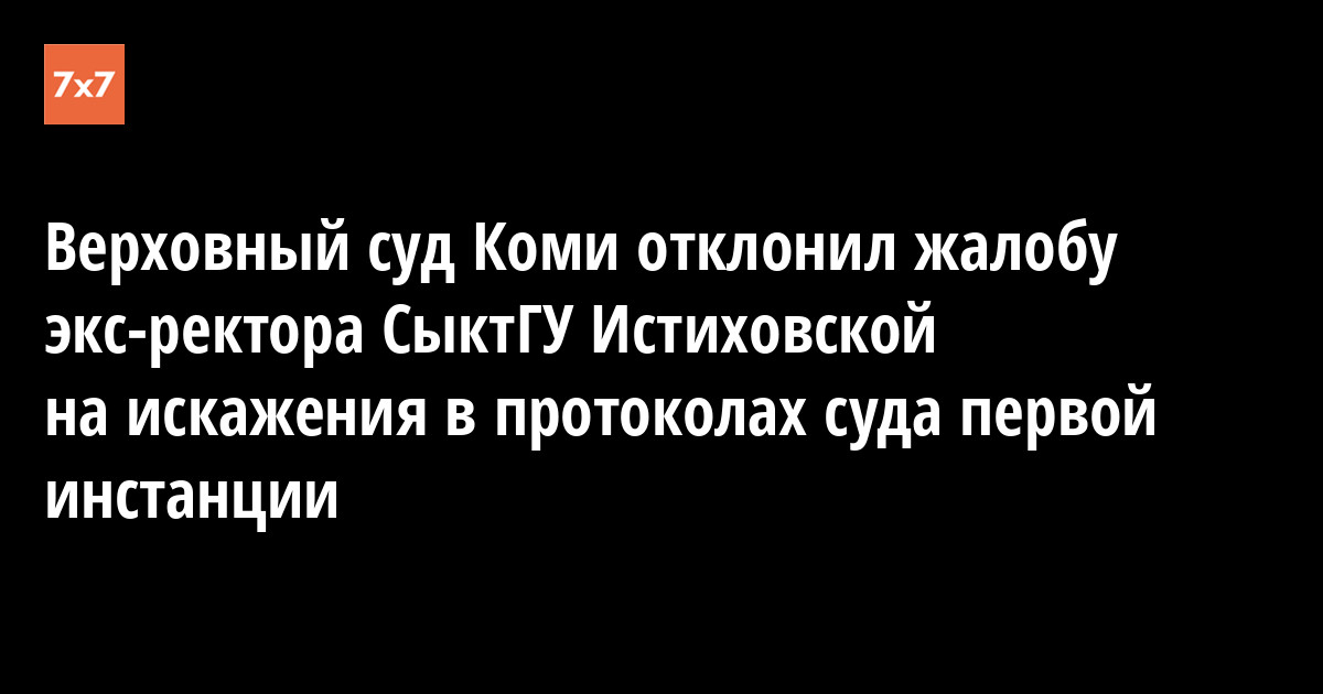 Верховный суд Коми отклонил апелляционную жалобу экс-ректора Сыктывкарского госуниверситета Марины Истиховской на неточности и искажения в протоколах суда первой инстанции. Заседание суда 28 сентября длилось около десяти минут, сообщает корреспондент «7x7».