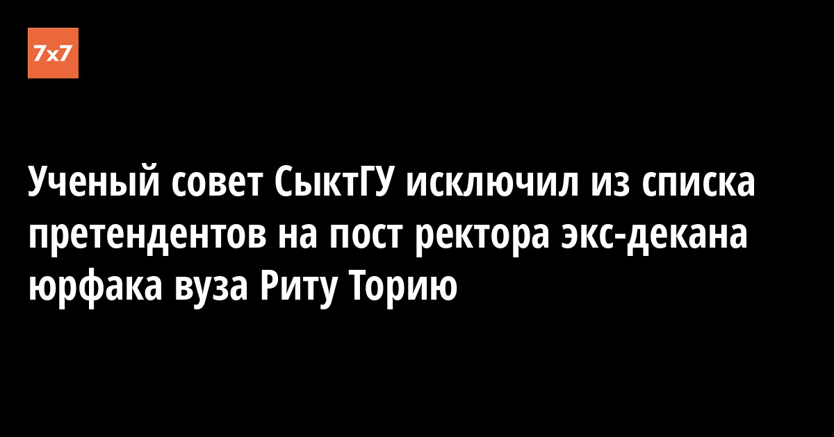 Ученый совет Сыктывкарского государственного университета 15 декабря утвердил список претендентов на пост ректора вуза, в него вошли четыре человека. Из списка исключена бывший декан юридического факультета СыктГУ Рита Тория. Как рассказал «7x7» проректор СыктГУ по административной и организационной работе Дмитрий Пинаевский, у Тории нет необходимого дополнительного образования.