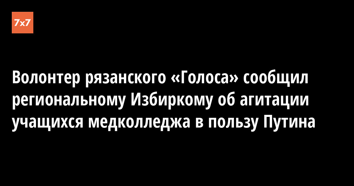 В Рязанском медицинском колледже состоялось агитационное мероприятие, на котором показали видеоролик с Владимиром Путиным. Волонтер движения «Голос» в Рязани Георгий Колотов обратился по этому поводу в избирательную комиссию региона. Об этом он сообщил корреспонденту «7x7» 22 февраля.