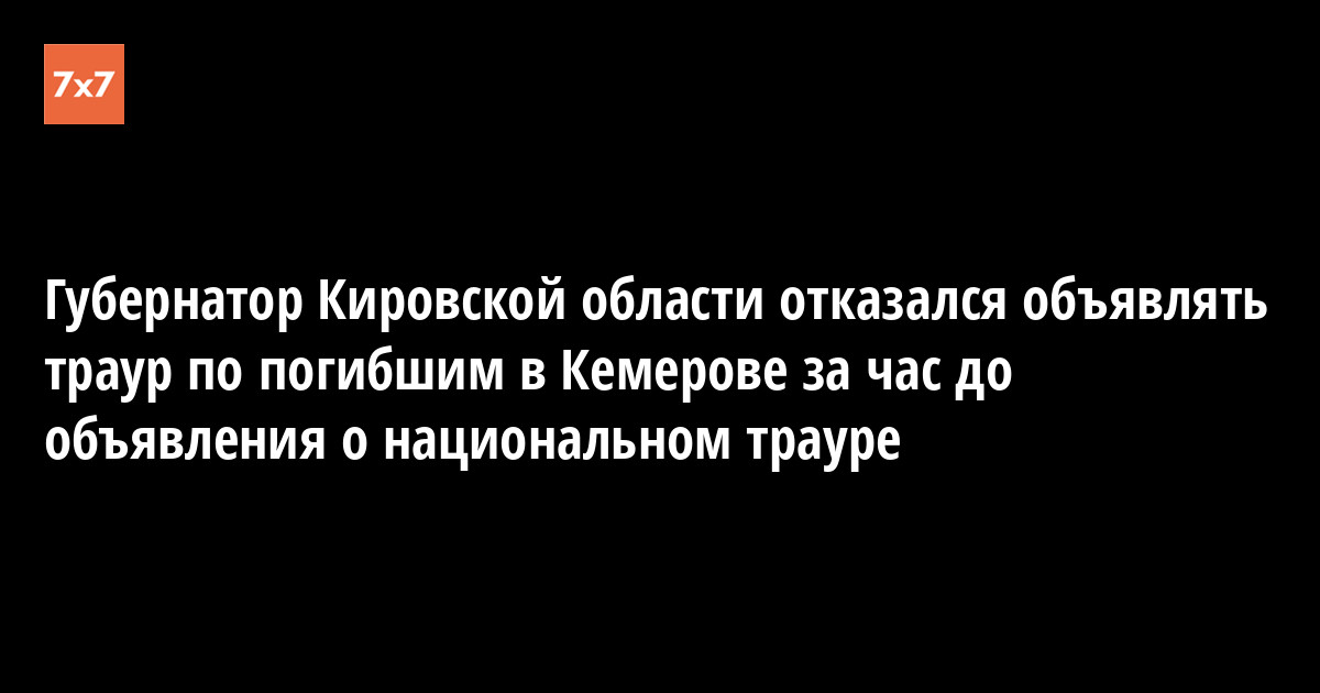 Губернатор Кировской области Игорь Васильев заявил, что в регионе не будет объявлен траур по погибшим при пожаре в кемеровском торговом центре «Зимняя вишня». Об этом 27 марта сообщило издание «Свойкировский».