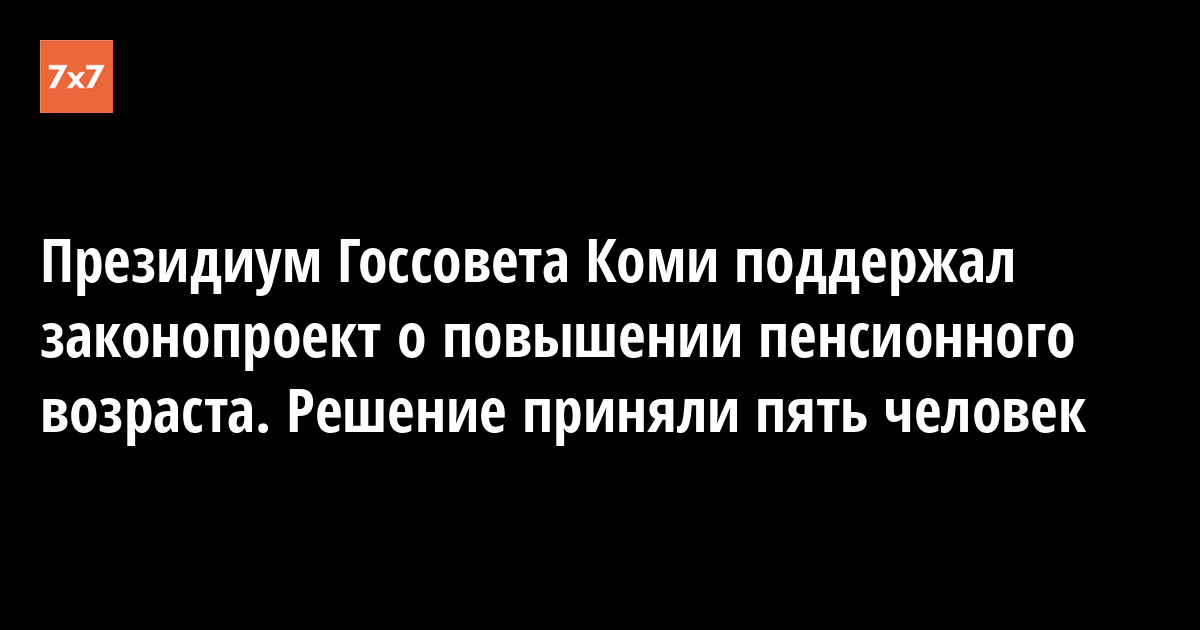 Президиум Государственного совета Коми 5 июля концептуально поддержал проект федерального закона о повышении пенсионного возраста. На заседании присутствовали семь депутатов Госсовета, пять из них проголосовали за законопроект, двое были против. На заседании президиума присутствовал корреспондент «7x7».