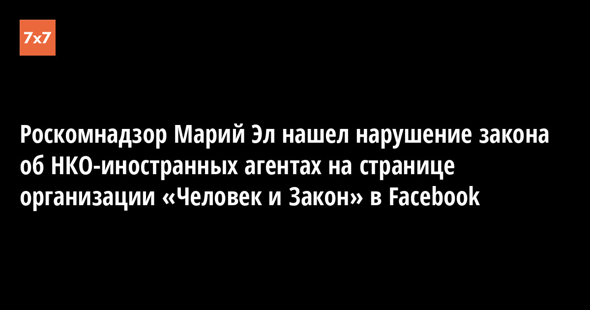 Марийский Роскомнадзор нашел нарушения в деятельности межрегиональной правозащитной организации «Человек и Закон» — председателя организации Ирину Протасову пригласили 11 июля для составления протокола об административном нарушении. Основанием стало заявление прокуратуры Марий Эл о том, что на странице организации в Facebook нет маркировки иностранного агента, сообщил 6 июля «7x7» сопредседатель «Человек и Закон» Сергей Подузов.
