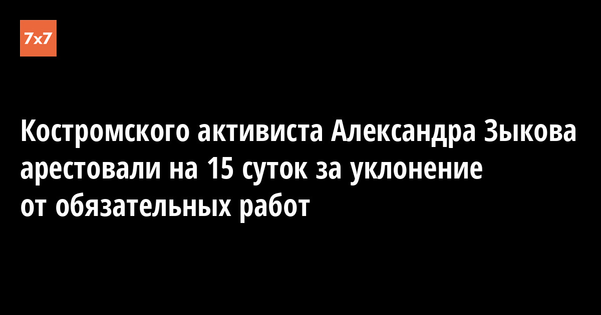 Красносельский районный суд Костромской области 17 июля назначил бывшему заместителю координатора штаба Алексея Навального в Костроме Александру Зыкову 15 суток административного ареста за пропуски обязательных работ. Об этом корреспонденту «7x7» сообщила его мать Татьяна Зыкова.
