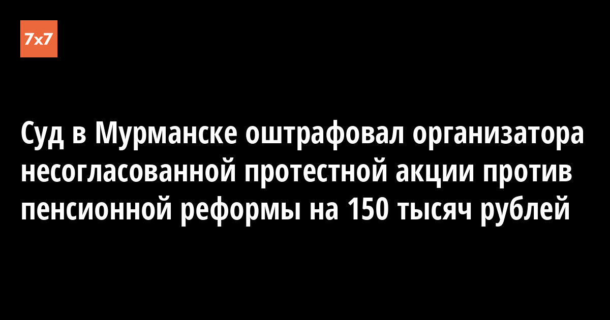 Октябрьский районный суд Мурманска 14 сентября оштрафовал на 150 тыс. руб. организатора несогласованной акции против повышения пенсионного возраста Алексея Григорьева. Об этом сообщается в группе «Команда Навального. Мурманск» в социальной сети «ВКонтакте».