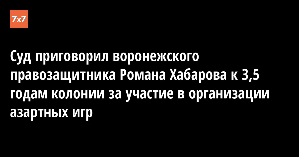 Правозащитник из Воронежа Роман Хабаров приговорен к 3,5 годам колонии общего режима за незаконную организацию и проведение азартных игр в составе преступной группы. Об этом он сообщил на странице в Facebook 8 ноября. По другой уголовной статье — участие в преступном сообществе — Хабаров был оправдан.