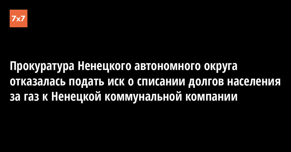 Прокуратура Ненецкого автономного округа Архангельской области отказалась подать иск о списании долгов населения за газ к Ненецкой коммунальной компании, как это сделала прокуратура Чеченской республики, подавшая такой иск против «Газпром межрегионгаз Грозный», сообщил «7x7» 19 февраля депутат Собрания депутатов НАО, первый секретарь окружного комитета КПРФ Михаил Райн.