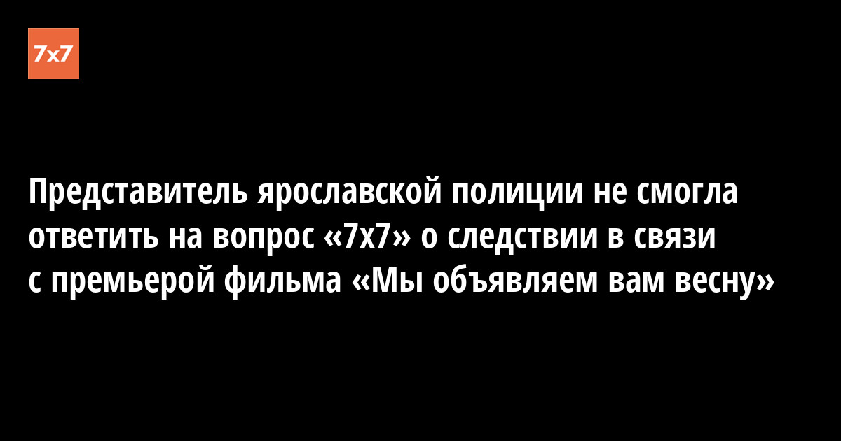 Замначальника отдела информации и общественных связей УМВД России по Ярославской области Юлия Никифорова 5 апреля пообещала уточнить информацию о следственных действиях в киноклубе «Нефть» в связи с премьерой фильма «Мы объявляем вам весну», сообщил корреспондент «7х7».