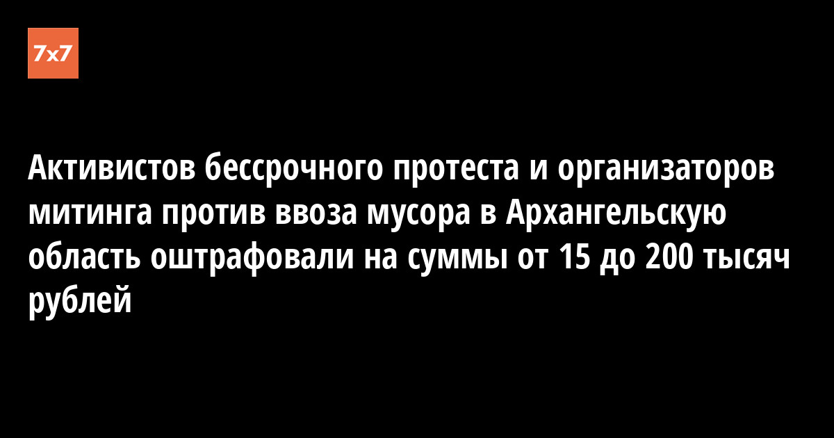 Октябрьский районный суд Архангельска 9 апреля рассмотрел дела семи активистов — участников протестных акций против ввоза мусора на станцию Шиес. Суд признал Александра Ларионова, Марину Петрову, Елену Калинину, Максима Пушкина, Евгения Богучарского, Дмитрия Секушина и Дмитрия Кузнецова виновными в участии в несанкционированных акциях 7 апреля. Они получили штрафы от 15 тыс. руб. до 200 тыс. руб. Об этом сообщил портал 29.ru, который вел трансляцию из зала суда.