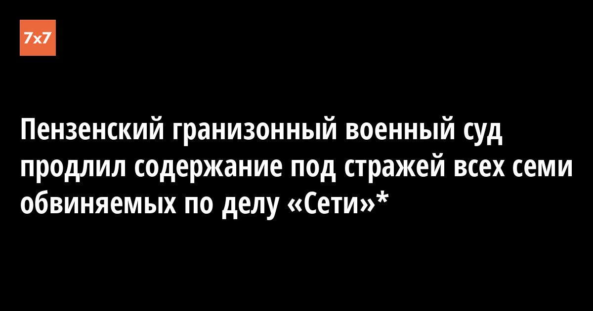 Пензенский гарнизонный военный суд 15 апреля продлил содержание под стражей до 6 октября 2019 года семи обвиняемых по делу «Сети»* — Илью Шакурского, Василия Куксова, Дмитрия Пчелинцева, Андрея Чернова, Армана Сагынбаева, Михаила Кулькова и Максима Иванкина, сообщил корреспондент «7x7» из коридора суда.