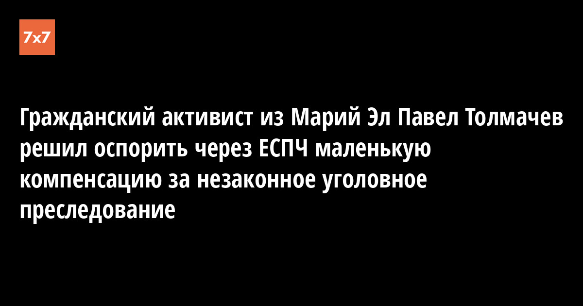 Гражданский активист Павел Толмачев подал жалобу в Европейский суд по правам человека (ЕСПЧ), сообщила 8 мая правозащитная организация «Человек и закон». Йошкар-Олинский городской суд назначил Толмачеву компенсацию за незаконное задержание в размере 4 тыс. руб. Активист посчитал ее слишком низкой. Верховный суд Марий Эл оставил решение суда первой инстанции без изменений, поэтому активист обратился в ЕСПЧ.