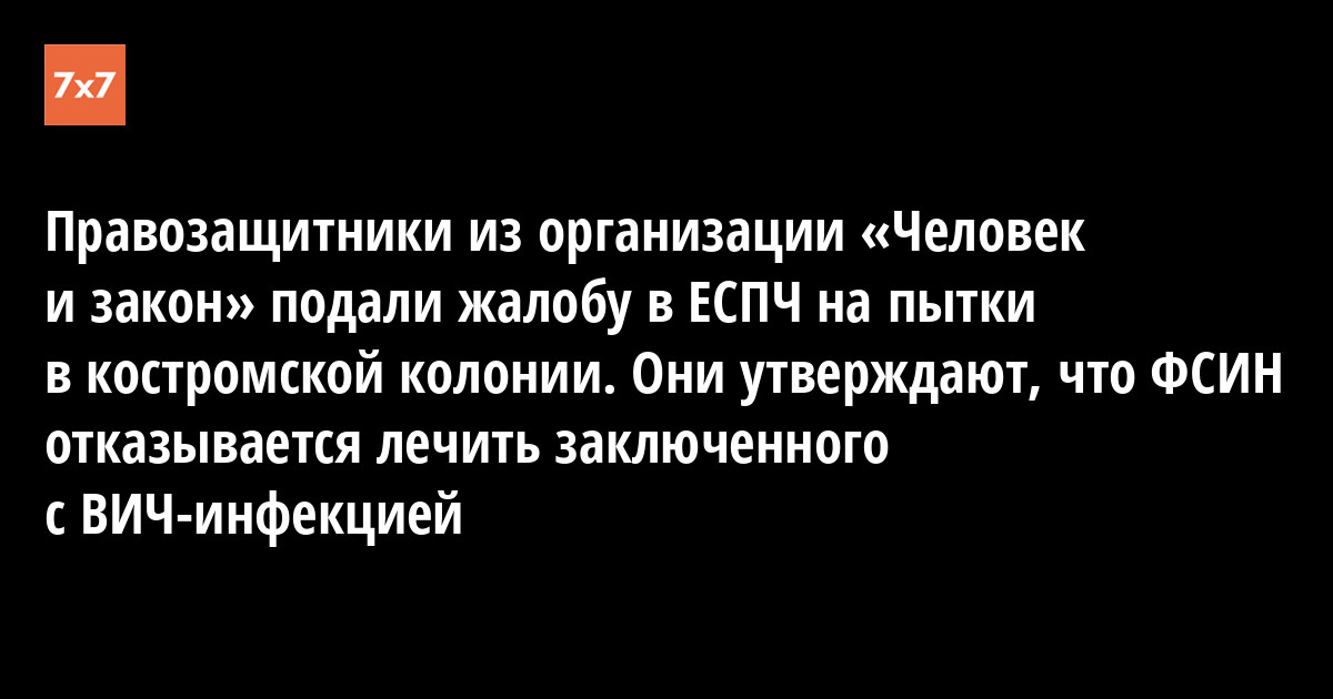 Правозащитники из организации «Человек и закон» подали жалобу в Европейский суд по правам человека на бесчеловечное обращение от имени заключенного с ВИЧ-инфекцией, отбывающего наказание в исправительной колонии №1 Костромской области. Об этом 13 мая сообщила правозащитная организация на своем сайте.