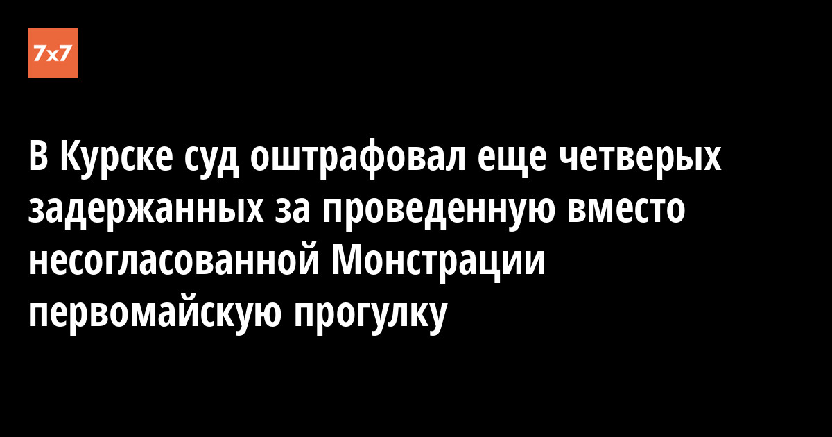 Во время прогулки 1 мая в Курске полиция задержала семь человек, включая организатора Ивана Звягина, и составила на них протоколы за нарушение правил проведения публичного мероприятия (часть 5 статьи 20.2 Кодекса об административных правонарушениях РФ). Дело Звягина о нарушении правил проведения публичного мероприятия организатором суд отложил на 6 июня из-за невозможности допросить полицейского, который его задержал, о чем «7x7» сообщили в пресс-службе суда.