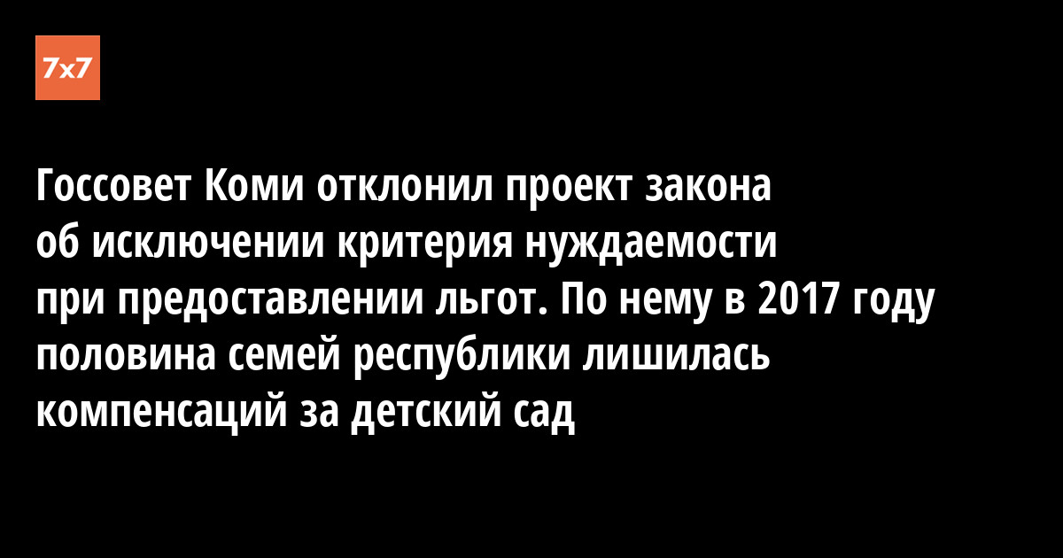 На заседании Государственного Совета Коми 20 июня депутаты рассматривали отмену критерия нуждаемости в республиканском законе №144, из-за которого два года назад половина семей республики лишились компенсаций за детский сад. Депутатам не хватило одного голоса, чтобы проект приняли в первом чтении и отправили на доработку. Теперь его нельзя рассматривать в течение года, сообщил корреспондент «7x7».