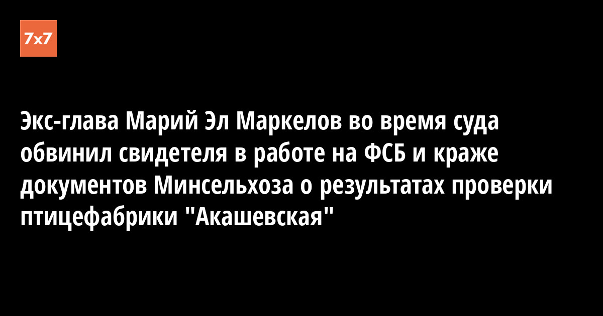 Обвиняемый в коррупции бывший глава республики Марий Эл Леонид Маркелов во время судебного заседания в Нижегородском районном суде 21 июня высказал корреспонденту "7х7" мнение, что свидетель обвинения, чиновник Министерства сельского хозяйства Марий Эл Мира Колесникова, работала на Федеральную службу безопасности и украла из здания министерства документы о субсидировании птицефабрики «Акашевская».