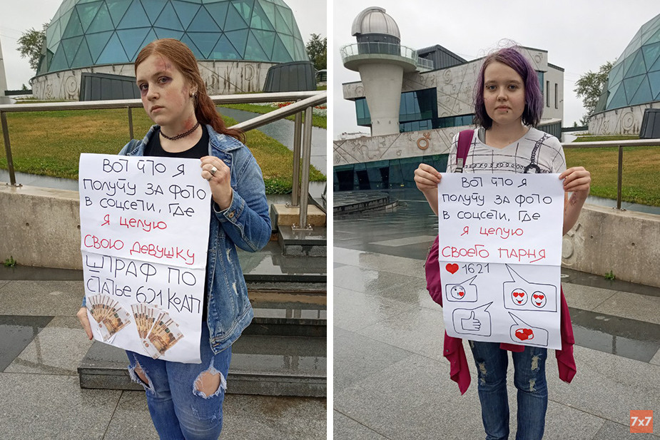 ЛГБТ-активисты Алан Ерох и Глория Руд вышли с плакатами к культурно-просветительскому центру имени В. В. Терешковой в центре Ярославля. На одном из плакатов с подписью «Вот что я получу за фото в соцсети, где целую своего парня» автор изобразил лайки и одобрение подписчиков. На втором плакате написано: «Вот что я получу за фото в соцсети, где я целую свою девушку. Штраф по статье 6.21 КоАП».
