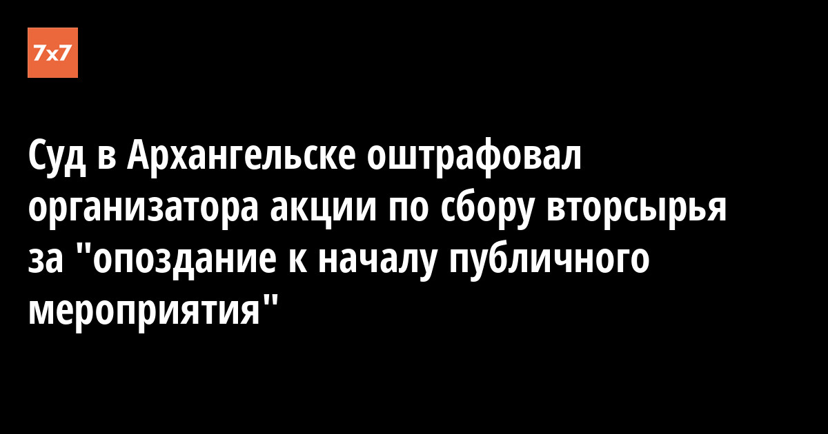 Соломбальский районный суд Архангельска оштрафовал волонтера регионального экологического движения «42» Татьяну Рыжову на 10 тыс. руб. за "опоздание" к началу организованного ею публичного мероприятия – акции по сбору вторсырья «Разделяй и Помогай». Об этом «7x7» сообщил 3 июля корреспондент, присутствовавший на судебном заседании.