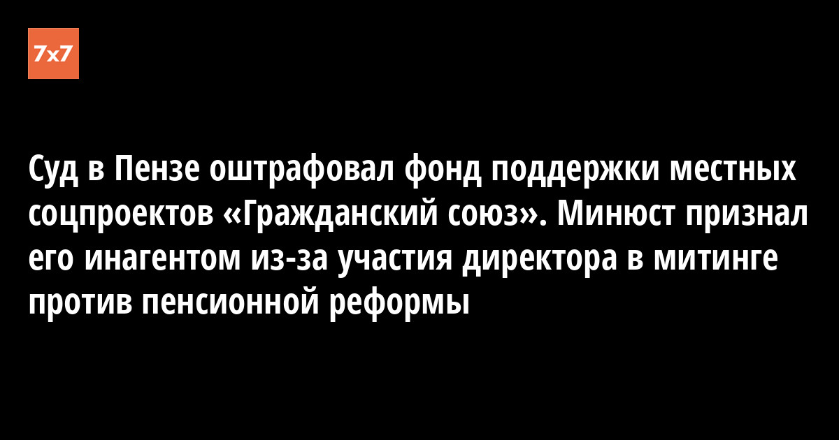 Судья Ленинского районного суда Пензы Наталья Макарычева оштрафовала некоммерческую организацию «Гражданский союз» на 300 тыс. руб. из-за отсутствия той в реестре иностранных агентов. Об этом «7x7» сообщил исполнительный директор фонда Олег Шарипков.