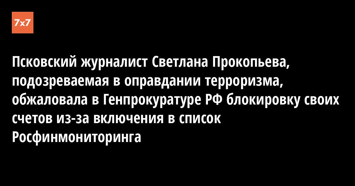 Журналист из Пскова Светлана Прокопьева направила в Генпрокуратуру РФ жалобу о необоснованной блокировке ее счетов и включении в список террористов и экстремистов Росфинмониторинга. Об этом она написала на странице в Facebook 11 июля. Журналиста обвиняют в оправдании терроризма.