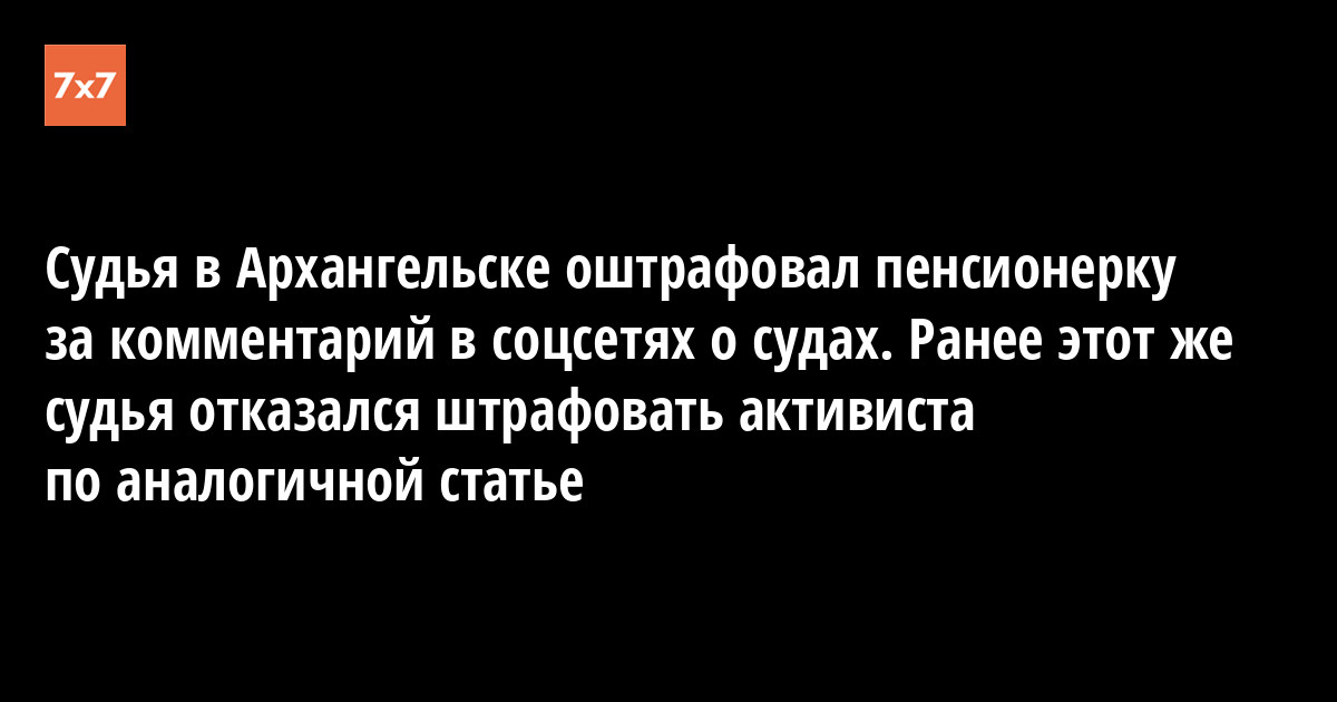 Судья Октябрьского районного суда Архангельска Сергей Ярмолюк оштрафовал на 30 тыс. руб. пенсионерку Елену Макарову за «неуважение» к полицейским и судьям за комментарий после несанкционированного митинга 7 апреля в Архангельске. Ранее он отказался штрафовать местного жителя Александра Пушкина по аналогичной статье из-за того, что это противоречит Конституции России. Эту информацию 19 июля подтвердил корреспонденту «7x7» защитник Макаровой Алексей Куроптев, сотрудничающий с «Международной Агорой».