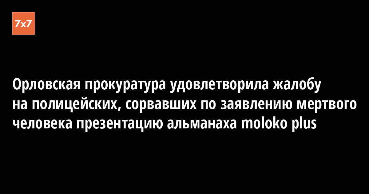 Прокуратура Орловской области удовлетворила жалобу главного редактора альманаха moloko plus Павла Никулина на действия сотрудников управления МВД Орла, которые сорвали презентацию издания. Прокуроры обнаружили нарушения в действиях орловской полиции и выписали представление об их устранении, сообщил 1 августа в своем Telegram-канале координатор орловского отделения «Открытой России» Сергей Носов.