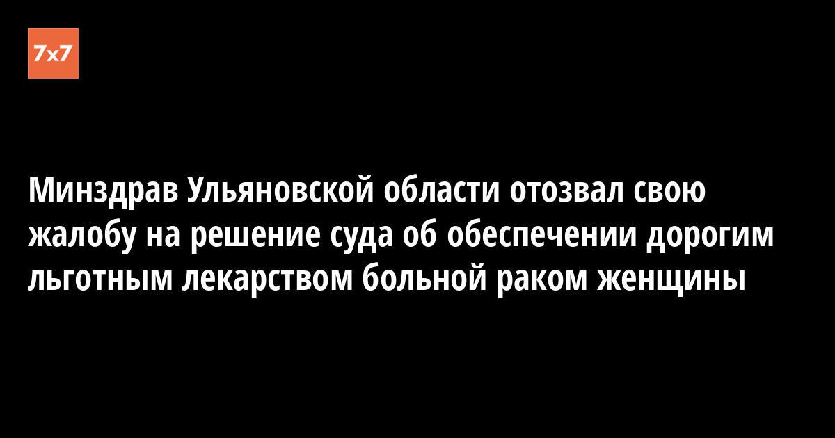 Министерство здравоохранения по Ульяновской области отозвало апелляционную жалобу на решение Заволжского районного суда обеспечить дорогим льготным лекарством больную раком 29-летнюю Рамилю Волгину. Об этом 2 августа сообщил «7х7» ее муж Дамир Волгин. Обещавший решить эту проблему губернатор Сергей Морозов Волгиным не позвонил.