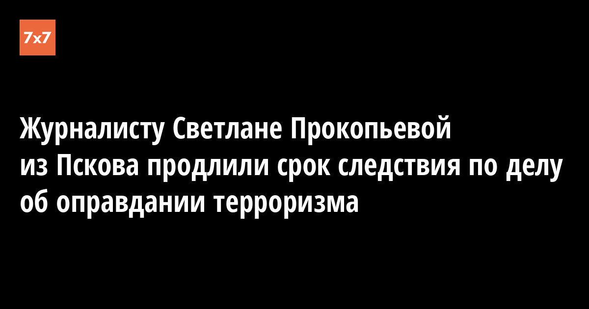 Следствие по делу об оправдании терроризма в эфире радиостанции «Эхо Москвы» в Пскове в авторской программе Прокопьевой продлится до ноября и составит десять месяцев. Прокопьева не стала подробно комментировать очередное продление срока следствия по ее делу. Отвечая на вопрос корреспондента «7×7», как она оценивает решение Псковского горсуда об отказе в апелляции «Псковской Ленте Новостей» и радиостанции «Эхо Москвы» в Пскове, которые пытались обжаловать штрафы за публикацию ее колонки, Прокопьева сказала: