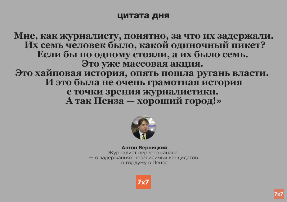Журналист Первого канала Антон Верницкий высказался о задержаниях независимых кандидатов в Пензенскую городскую думу на VIII фестивале СМИ Пензенской области «А мы из Пензы» 5 сентября. На инфоруме Союза журналистов России в рамках фестиваля Верницкий сказал, что эта тема — голодовка и задержание кандидатов — сразу попалась ему на глаза.