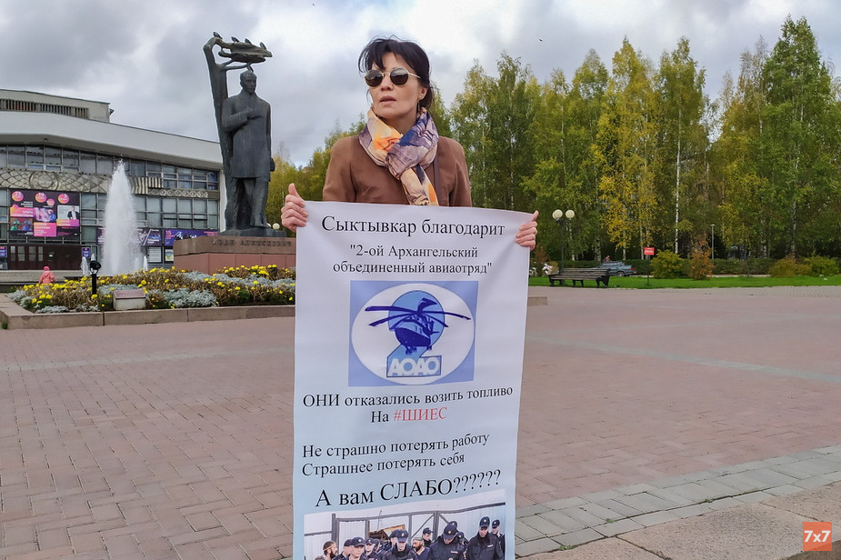 Экоактивисты Коми провели серию одиночных пикетов в поддержку 2-го Архангельского объединенного авиаотряда, пилоты которого отказались перевозить топливо на станцию Шиес. Акция прошла в Сыктывкаре 15 сентября на Театральной площади, на ней побывал корреспондент «7х7».